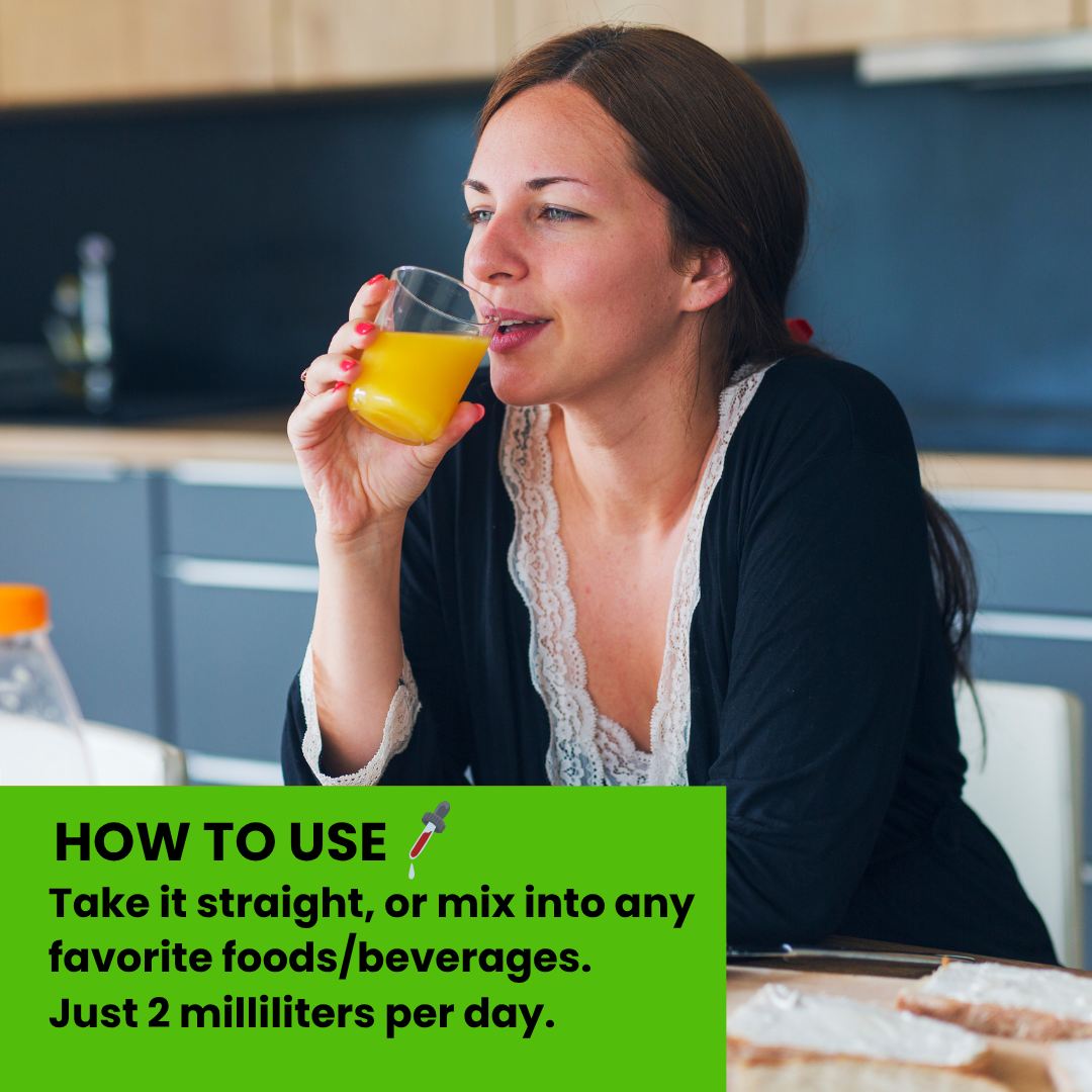 Take 2 drops under your tongue once a day with a meal. That’s it — no pills, no mixing, no guesswork.