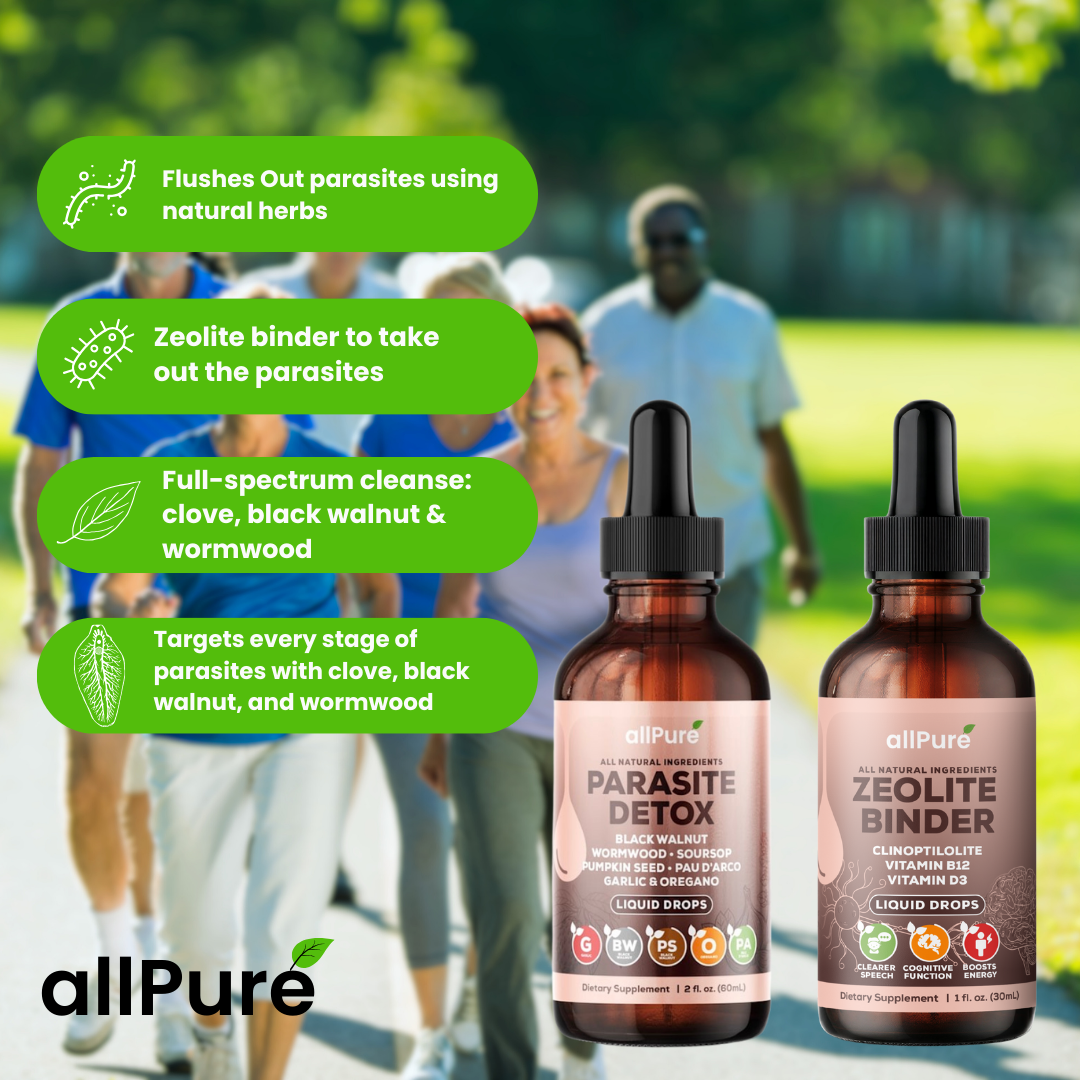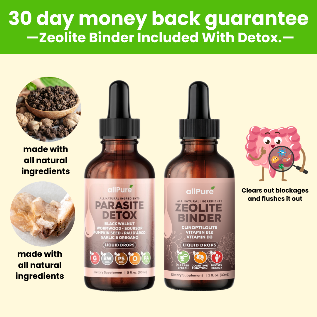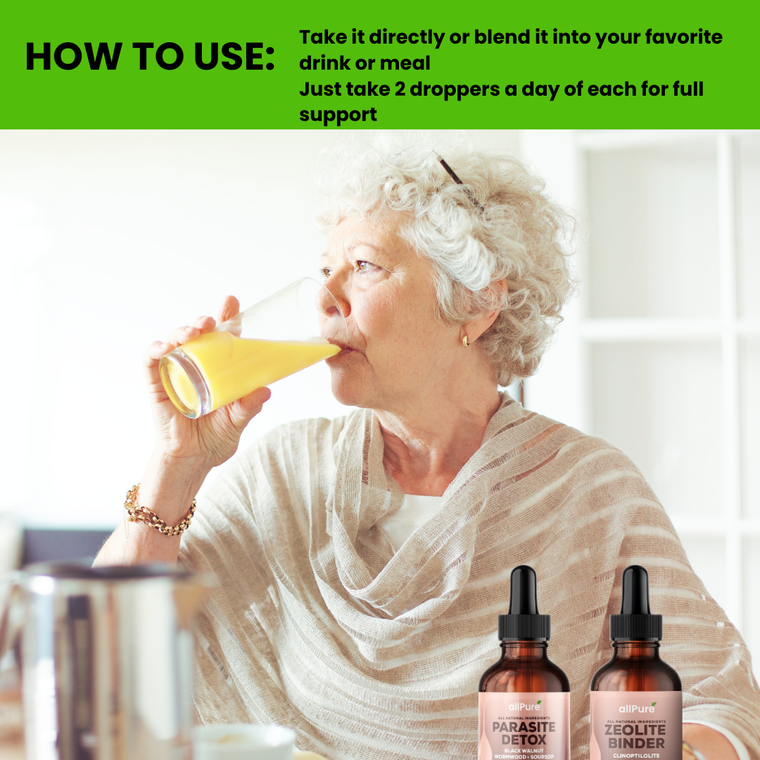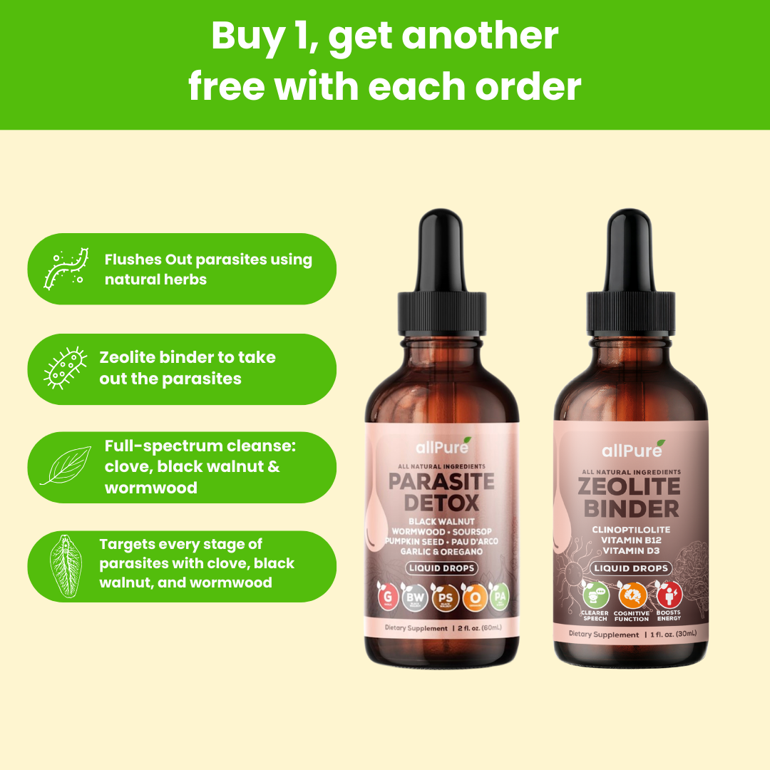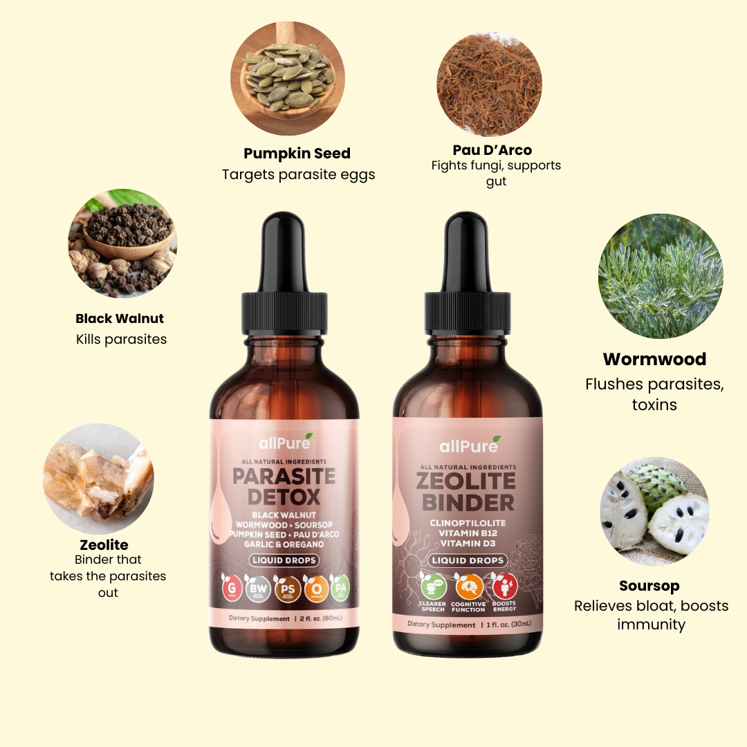 The Parasite Detox Drops help loosen and release the internal clutter weighing you down, while the Zeolite Binder traps what gets loosened so your body can flush it out cleanly—without the crash or overwhelm.